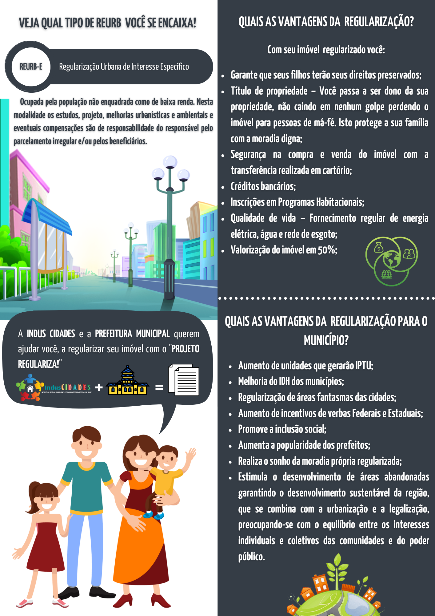 Instituída pela Lei Federal 13.465/2017, abrange medidas urbanísticas, ambientais, jurídicas e sociais destinadas à incorporação dos núcleos urbanos informais ao ordenamento territorial urbano e à titulação de seus ocupantes, tendo como principais objetivos melhorar as condições urbanísticas e ambientais em relação à situação de ocupação informal anterior, proporcionando acesso aos instrumentos de cidadania e de dignidade, com segurança jurídica e econômica aos seus beneficiários.